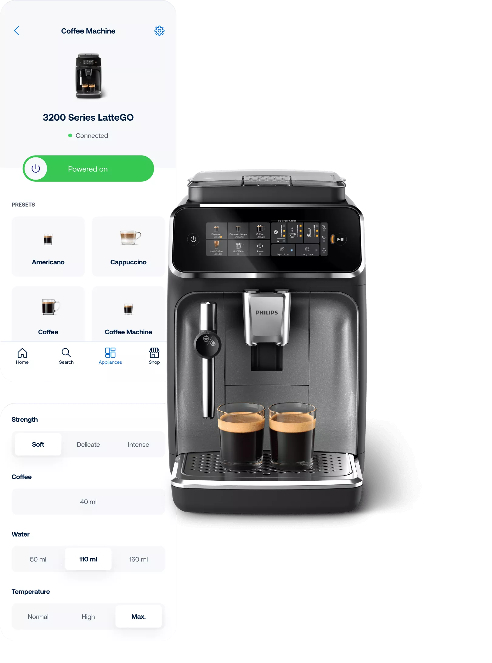 The core of the backend system is built to support connected IoT devices. Users manage and control their appliances via smartphone, enabling entirely new connected experiences.