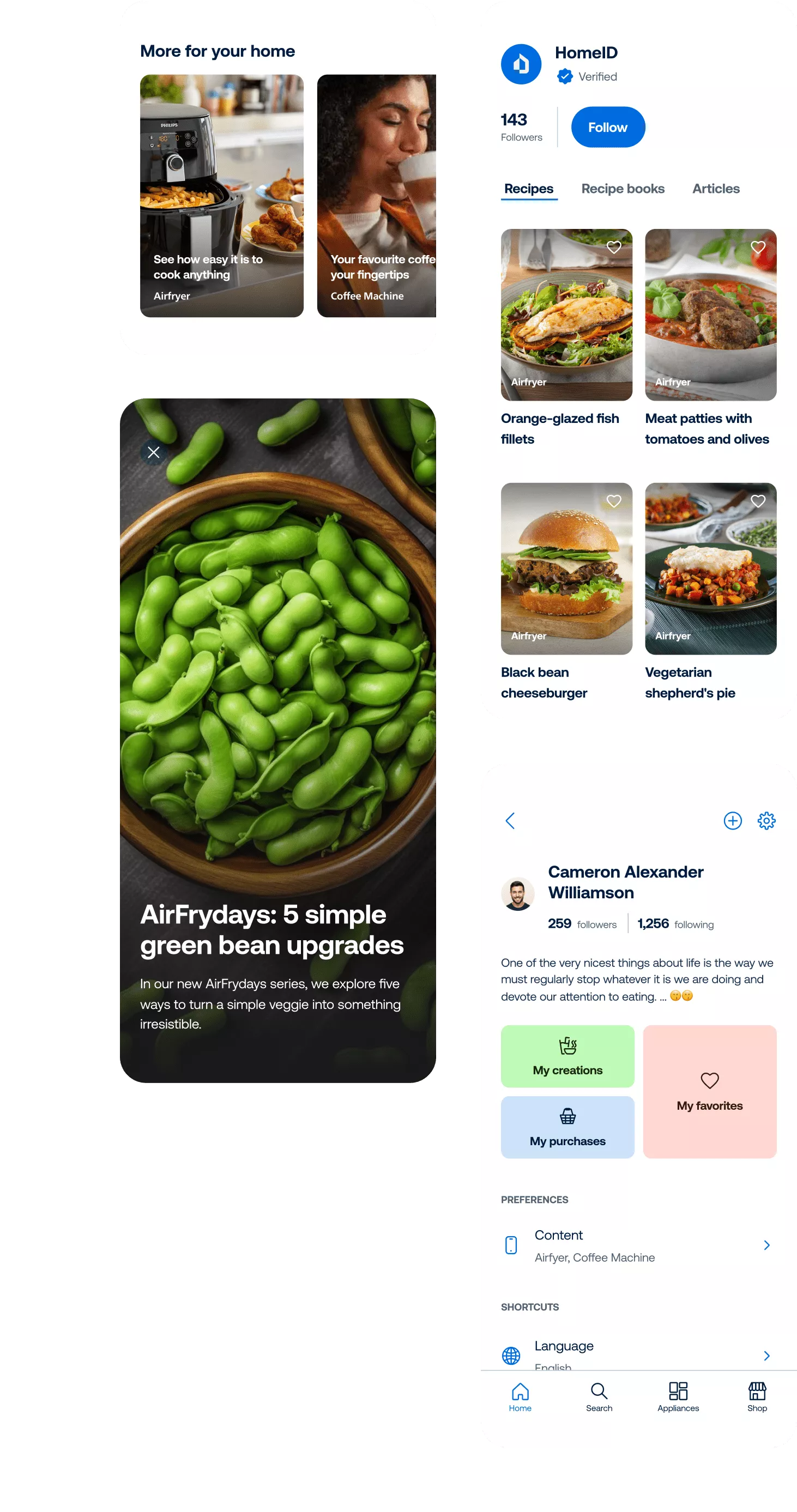We connected various appliances into a hub that helps users find tips, recipes, and other home inspiration. HomeID gathers previously divided users in one place, enabling a singular experience across all Philips home devices.