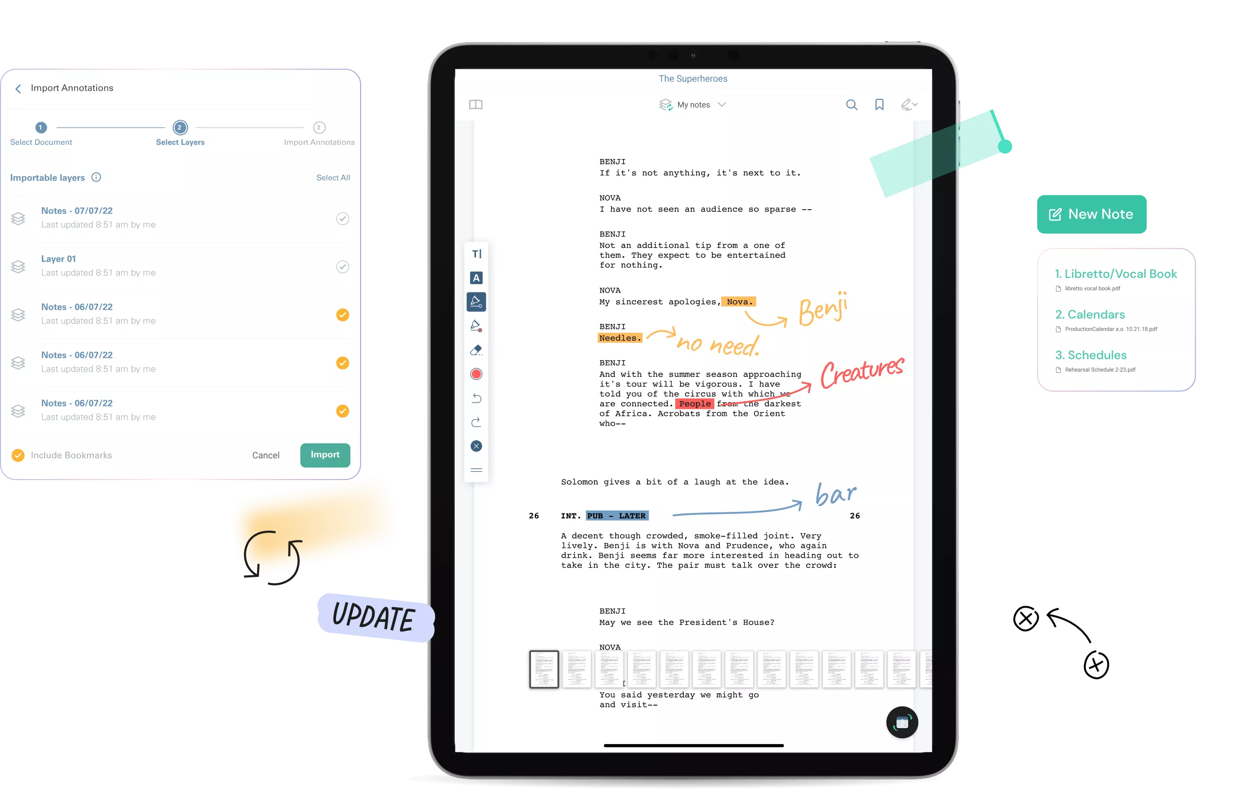 Annotation tools enable users to write notes, highlight, and sketch directly on the script. Using different layers, it is easy to separate, organize, and share notes with collaborators. All updates are synced across devices in real-time.