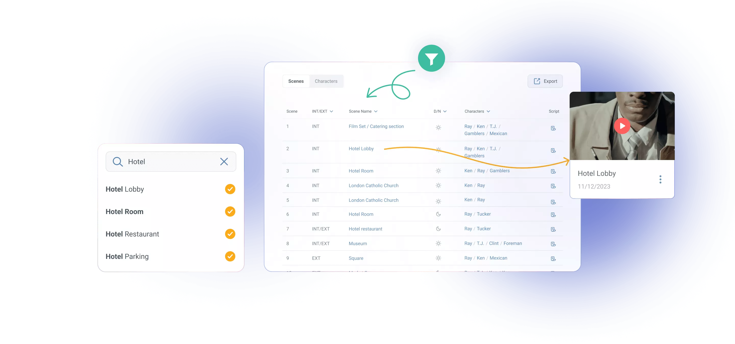 The script breakdown feature provides a holistic view of the entire production — scenes, characters, and locations are all pulled from the latest script.