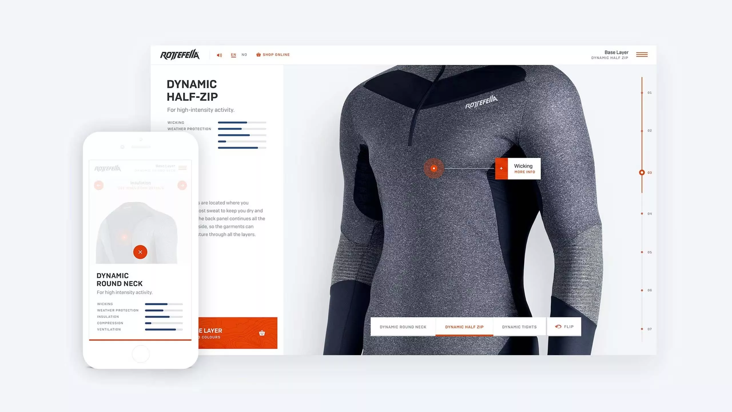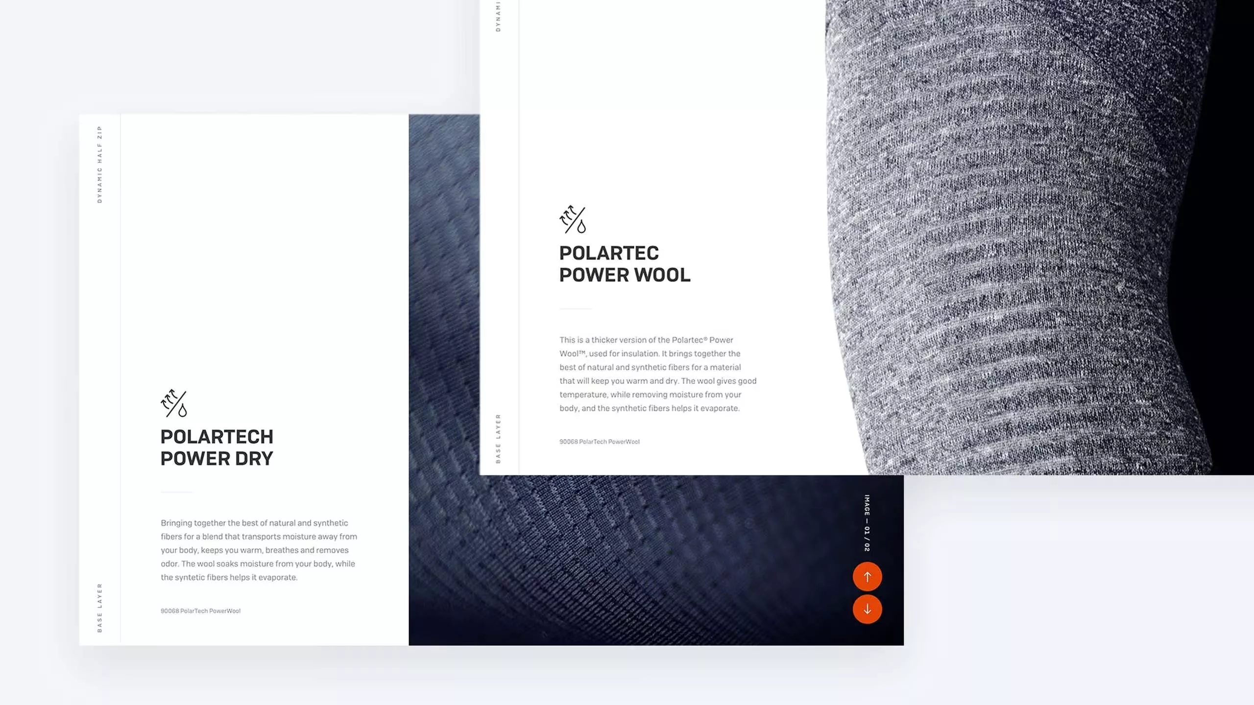 We designed and developed a scrolling narrative, mixing outdoor imagery and product photography. Garments were divided into sections, in which the user was invited to dive deeper to explore a range of features, including garment properties and finer design details.