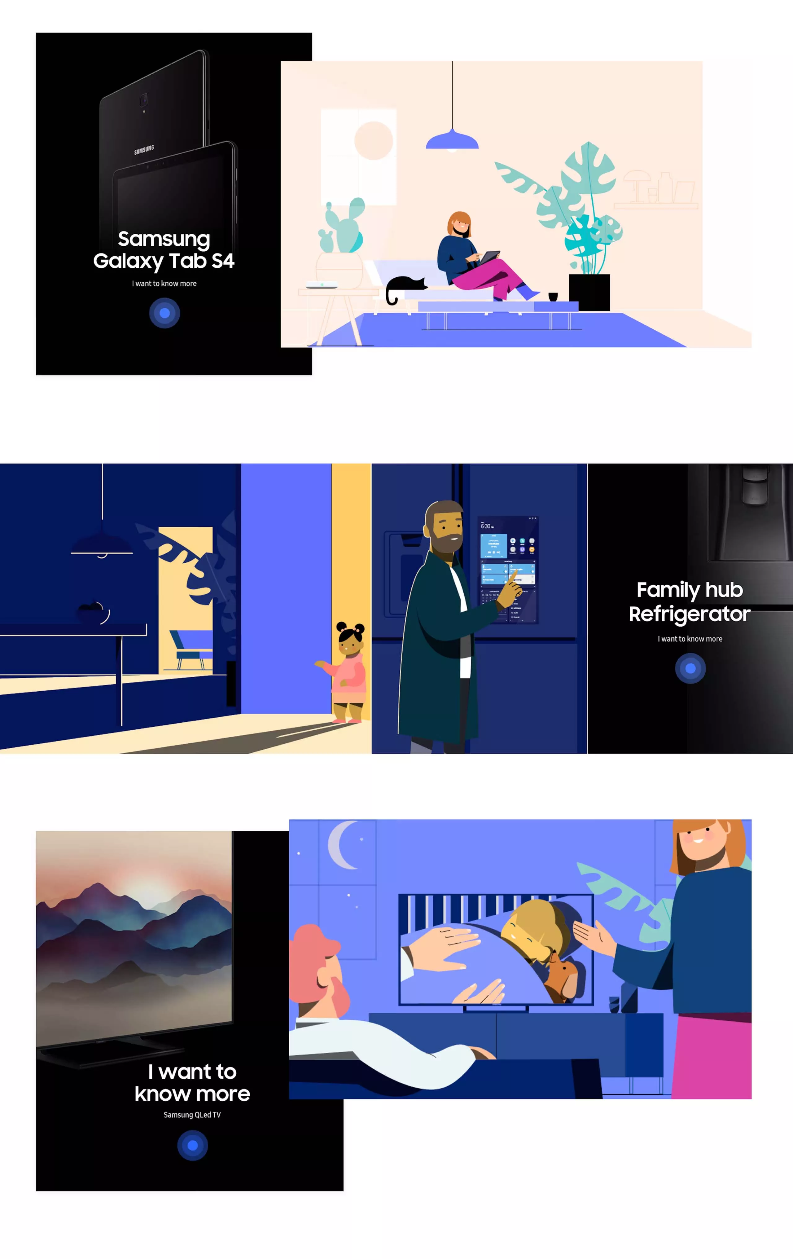 Derived from the Samsung brand guidelines, we created a family of illustrated characters that star in eight animated shorts. Each short tells a story about how connected products can ease everyday life.